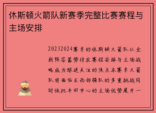 2023-2024赛季的休斯顿火箭队以全新阵容蓄势待发,赛程安排与主场战略成为球迷关注的焦点。本赛季火箭队将面临东西部强队的多重挑战,同时依托丰田中心的主场优势,展开一场场激动人心的对决。从揭幕战到收...