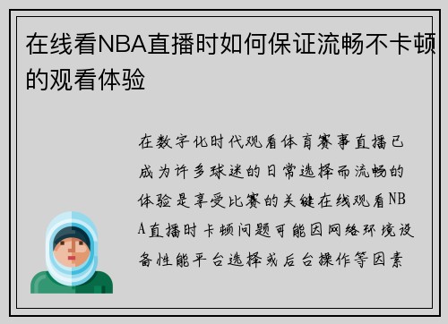 在数字化时代,观看体育赛事直播已成为许多球迷的日常选择,而流畅的体验是享受比赛的关键。在线观看NBA直播时,卡顿问题可能因网络环境、设备性能、平台选择或后台操作等因素而产生。本文将从优化网络连接、选择...