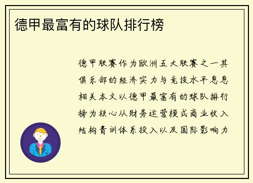 德甲联赛作为欧洲五大联赛之一,其俱乐部的经济实力与竞技水平息息相关。本文以德甲最富有的球队排行榜为核心,从财务运营模式、商业收入结构、青训体系投入以及国际影响力四个维度展开分析。通过梳理拜仁慕尼黑、多...