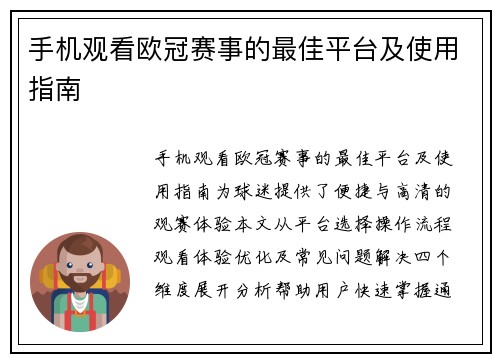 手机观看欧冠赛事的最佳平台及使用指南为球迷提供了便捷与高清的观赛体验。本文从平台选择、操作流程、观看体验优化及常见问题解决四个维度展开分析,帮助用户快速掌握通过手机观看欧冠的技巧。文章详细介绍了主流观...