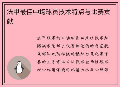法甲联赛的中场球员历来以技术细腻、战术意识出众著称,他们的存在既是球队攻防转换的枢纽,也是比赛节奏的主导者。本文从技术全面性、战术核心作用、体能对抗能力以及心理领袖特质四个维度,深入剖析法甲最佳中场球...